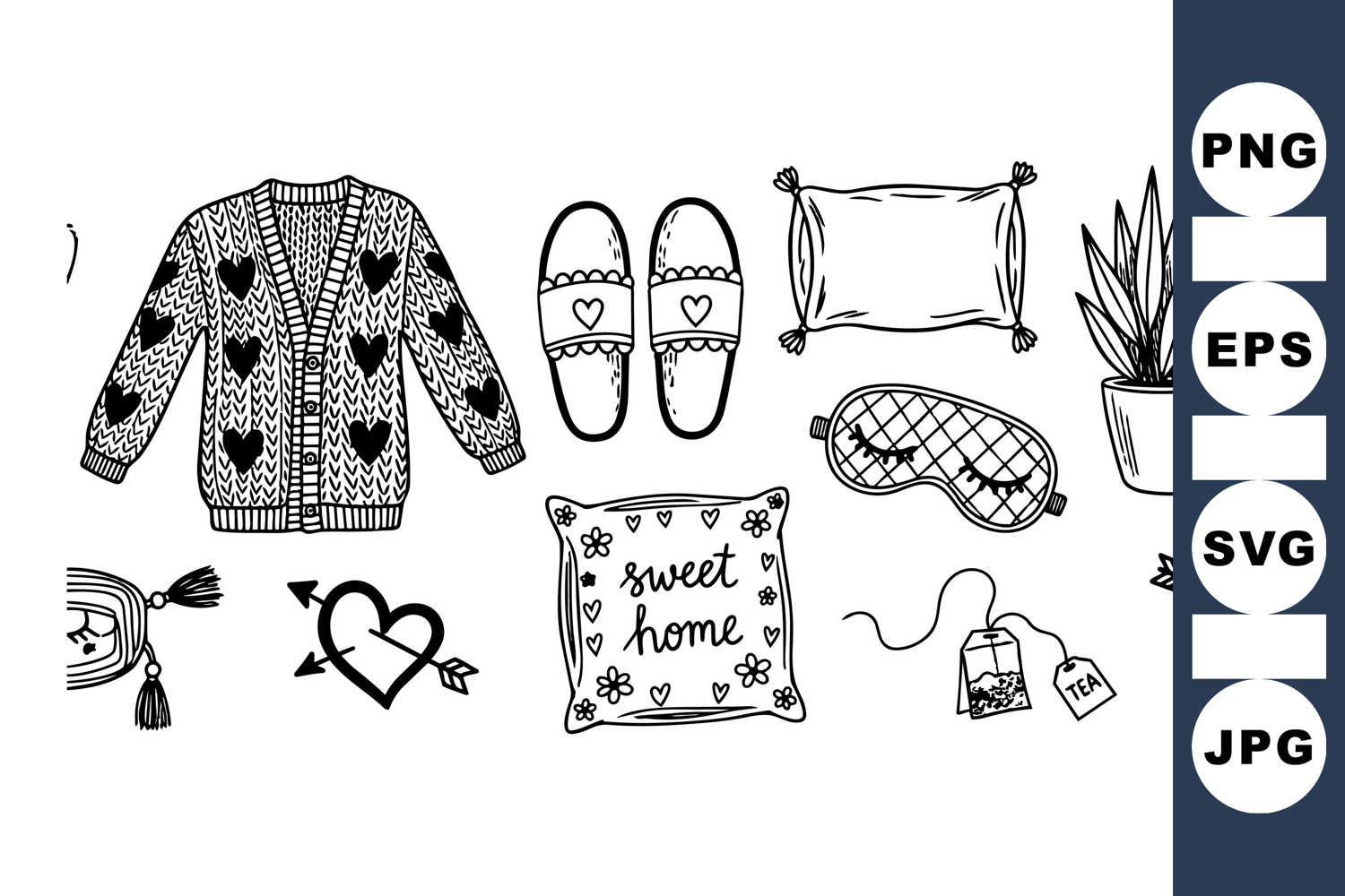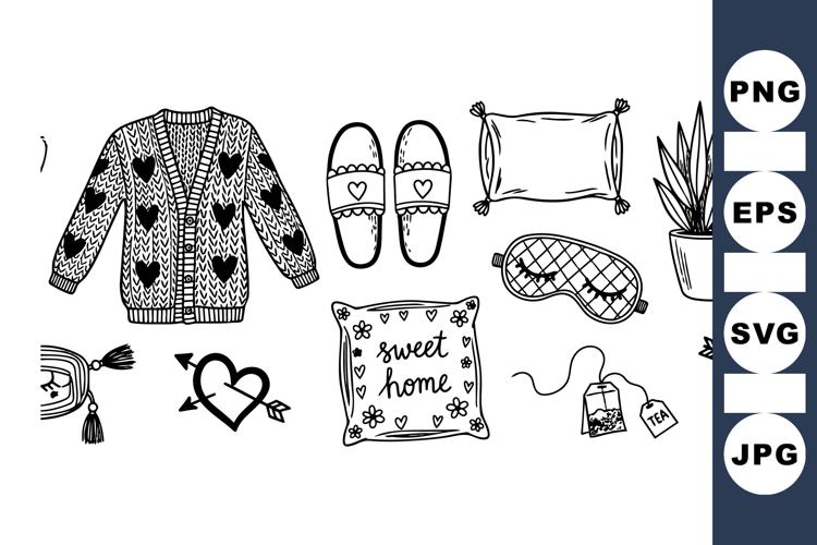 Hand Drawn Clipart Home Decor Graphics Digital Scrapbook Elements Tea Cup Illustration Printable Craft Kit Doodle Clipart Set Craft Supply Bundle Black And White Sketches Cozy Home Bundle Pillow And Slipper