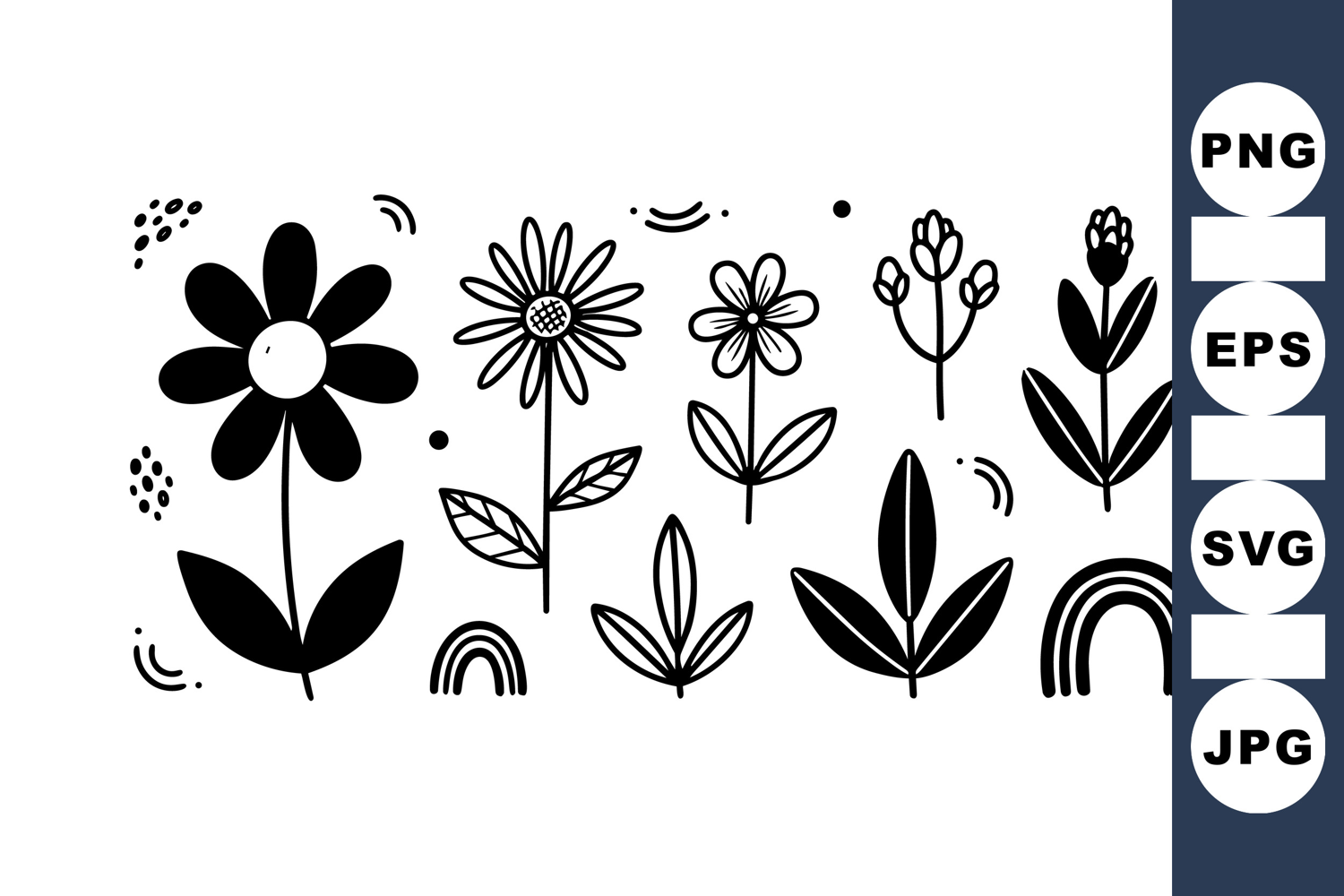 A collection of black and white whimsical flower and leaf illustrations with rainbows, perfect for decorative design, stationery, or branding with a playful mood