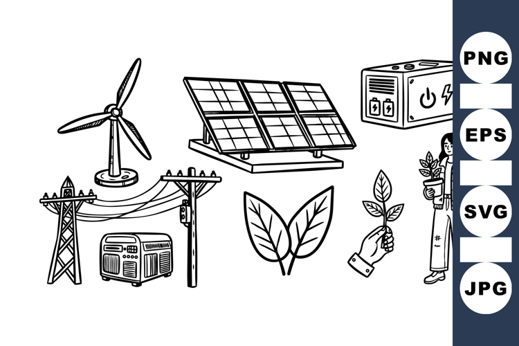 Renewable Energy Illustrations Solar Panel Clipart Set Wind Turbine Graphics Bundle Eco Friendly Design Pack Clean Power Vector Set Sustainable Energy Artwork Environmental Icons Collection Green Technology Illustrations Battery Backup Clipart Pack Energy Saving Visual Set
