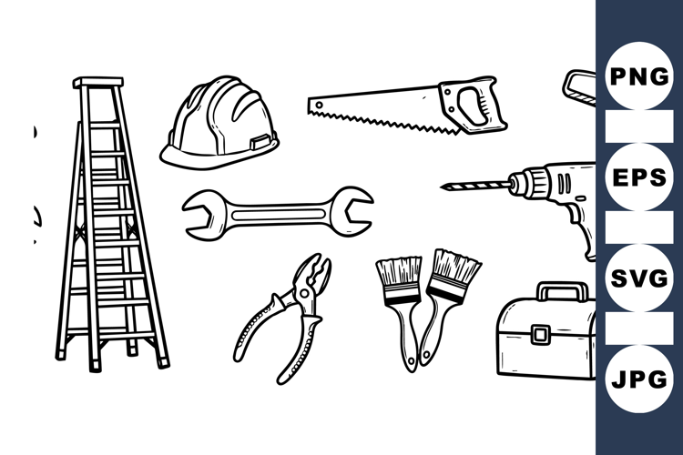 Simple black and white line drawing of common construction and repair tools such as ladder, helmet, saw, wrench, drill, pliers, brushes, and toolbox with clean minimal style.