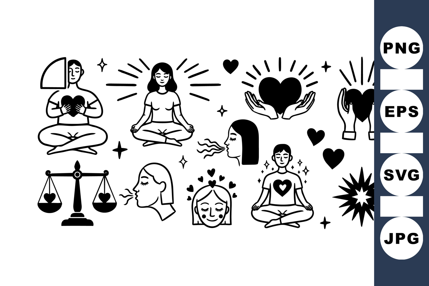 A collection of black and white line art features women meditating, hearts, scales, and peaceful faces, conveying mindfulness and balance in calm designs.