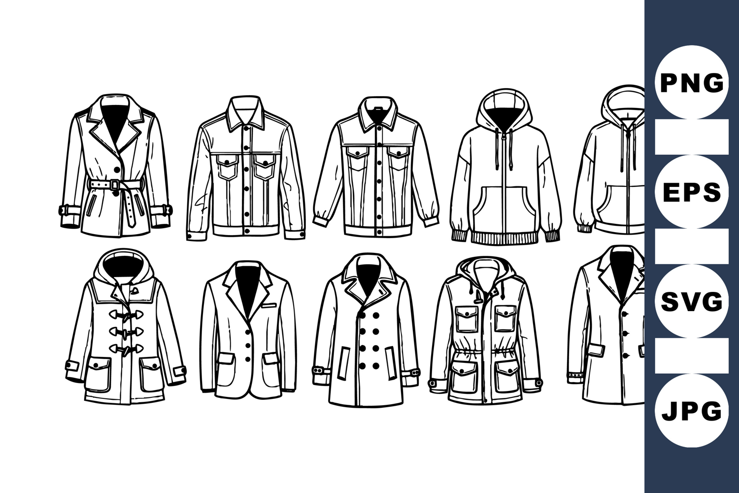 Collection of ten stylish black and white clothing illustrations showcasing various jacket and coat designs such as hoodies, blazers, and duffle coats in line art style, suitable for fashion design references, clothing catalogs, and editorial use, clean and minimalistic.