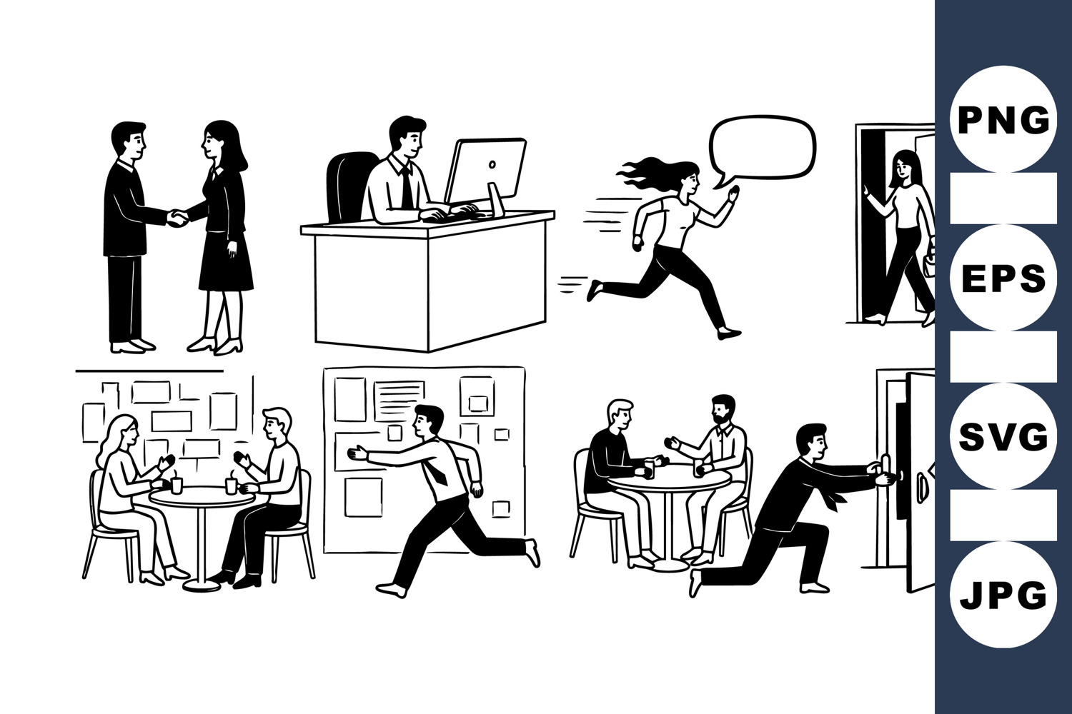 Comic style black and white illustrations show office workers shaking hands, running, working at desk, and holding doors in various business scenarios, dynamic and clear.