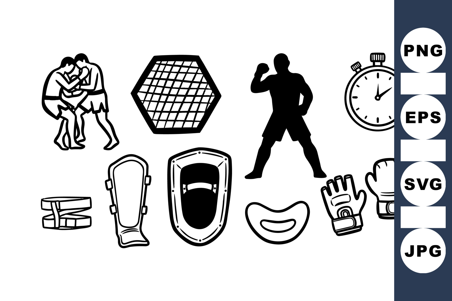 Wrestling Gear Clipart Protective Sports Equipment Wrestling Helmet Design Silhouette Glove Illustrations Stopwatch Timer Clipart Wrestler Training Gear Combat Sports Icons Match Day Equipment Athlete Protective Set Grappling Gear Collection