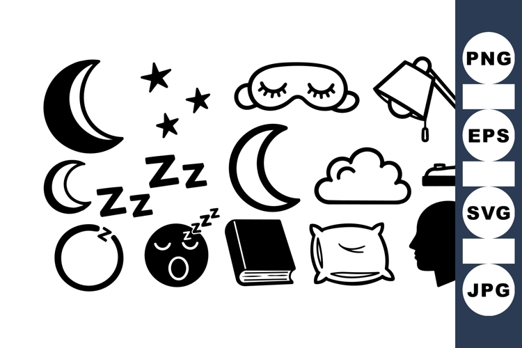 Minimalist black and white icons depict sleep related objects and symbols, including moons, stars, pillows, and lamps, in clean line art style for editorial or print use, calm and simple.