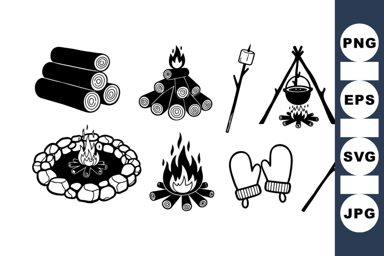 Collection of black and white vector camping icons containing campfire logs, fire pit, roasting marshmallow stick, mittens, and cooking pot, simple outdoors style