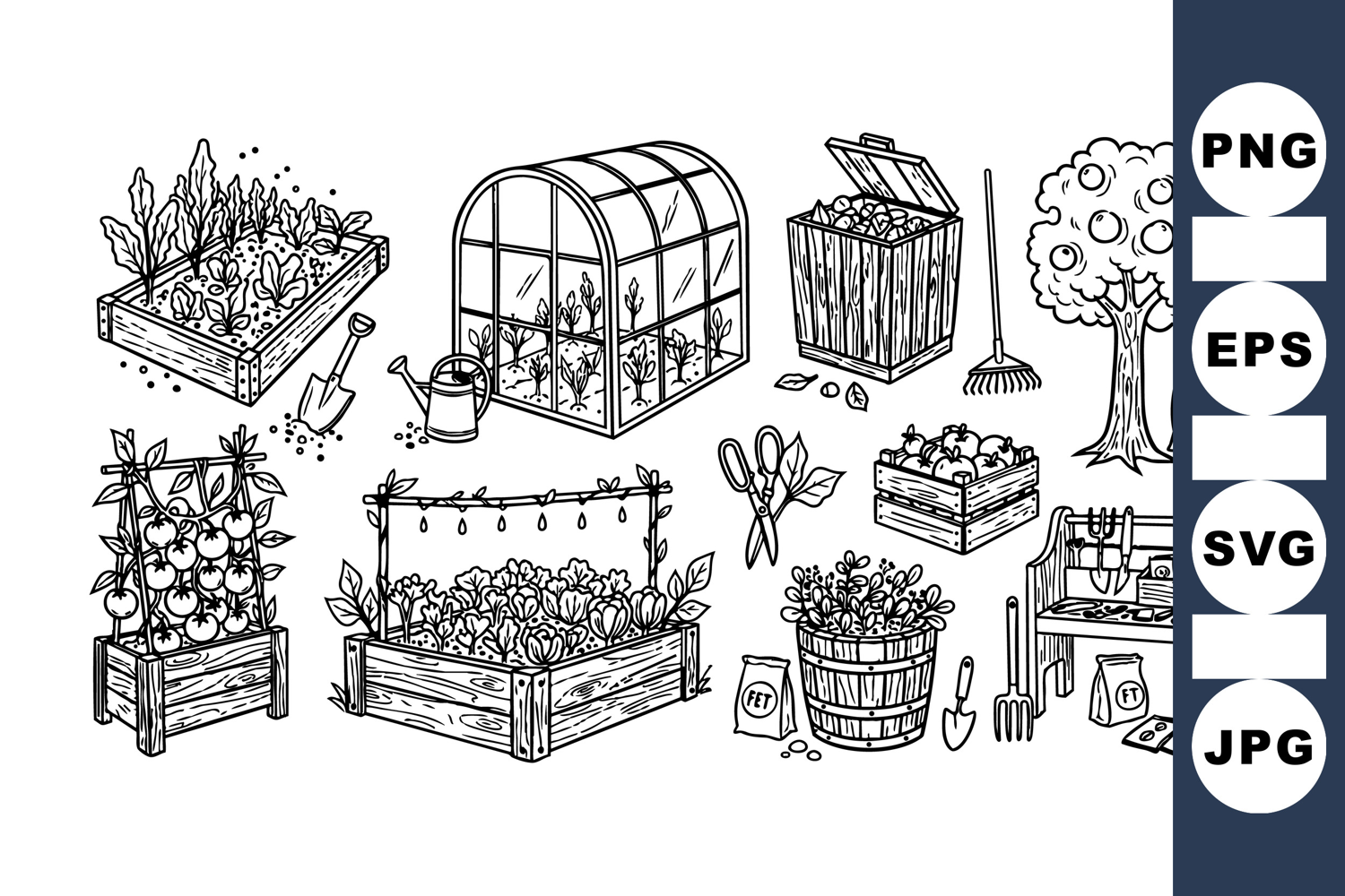 Hand drawn black and white line art featuring raised garden beds, greenhouse, tree, and tools for planting and tending a home garden space.