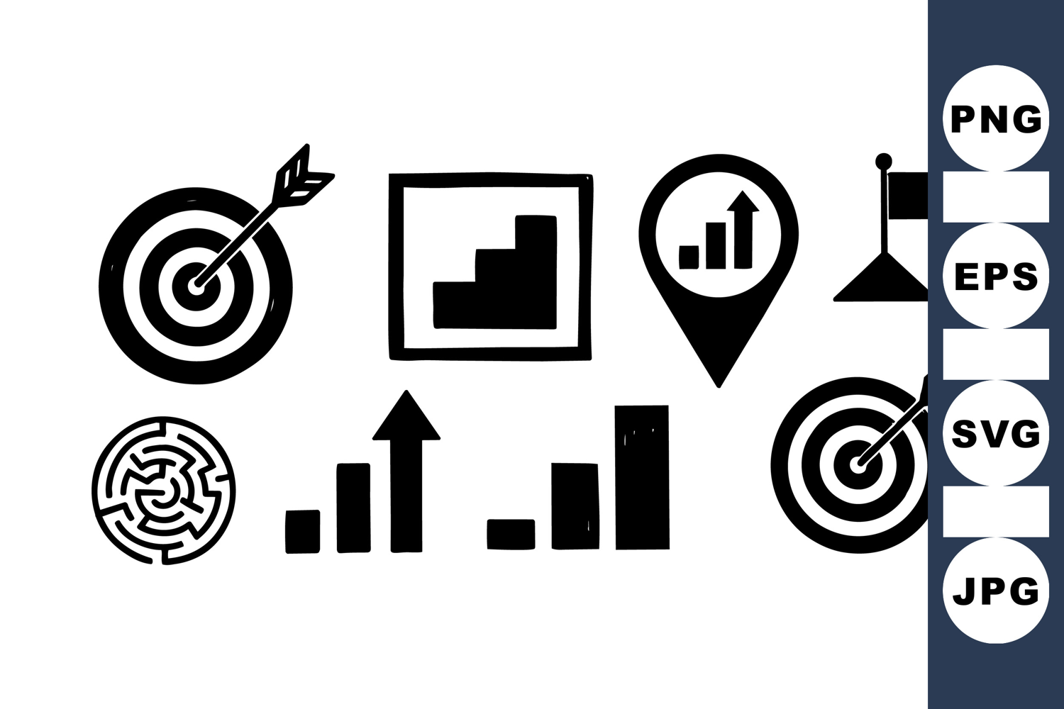 Black silhouette business icons depict targets with arrows, growth charts, location markers, flags, and maze symbols, representing strategy and progress concepts in minimal style.