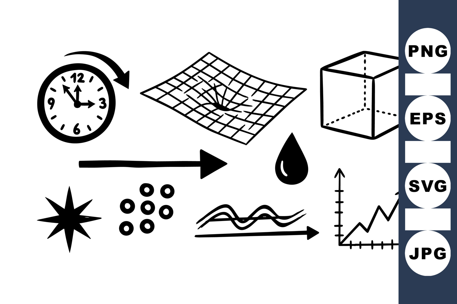 Simple black and white hand drawn scientific icons feature time, gravity, space time grid, particles, wave motion, fluid drop, and growth graph, ideal for educational and scientific illustrations, minimalist aesthetic.