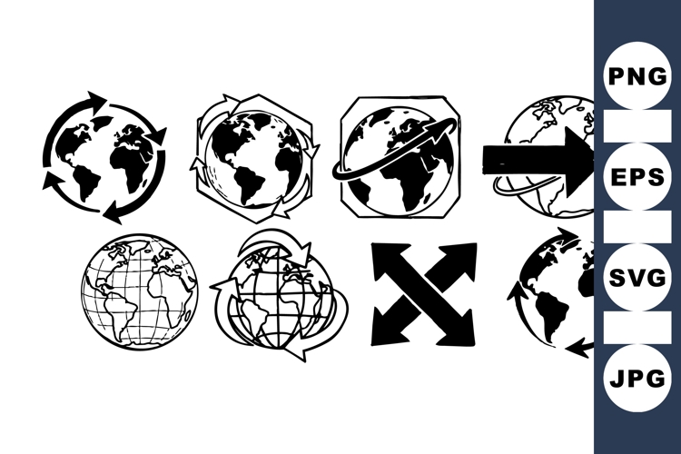 Collection of black and white globe icons combined with arrows indicating directions, international movement, and global connectivity in flat design illustration style, ideal for web and app navigation, corporate branding, and infographics, simple and clear composition conveys worldwide communication concept in a minimalistic way.