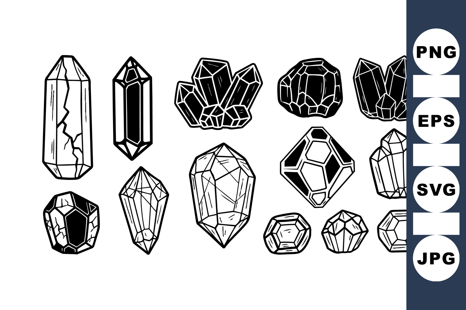 Detailed black and white line art depicting assorted crystal and gemstone shapes with intricate faceting, suitable for design, education, and tattoo inspiration, minimalistic style