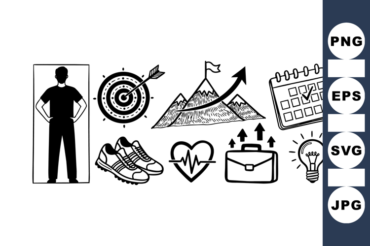 A collection of hand drawn black and white business and lifestyle icons featuring a man, target, mountain, calendar, shoes, heart rate, briefcase, and light bulb drawings.