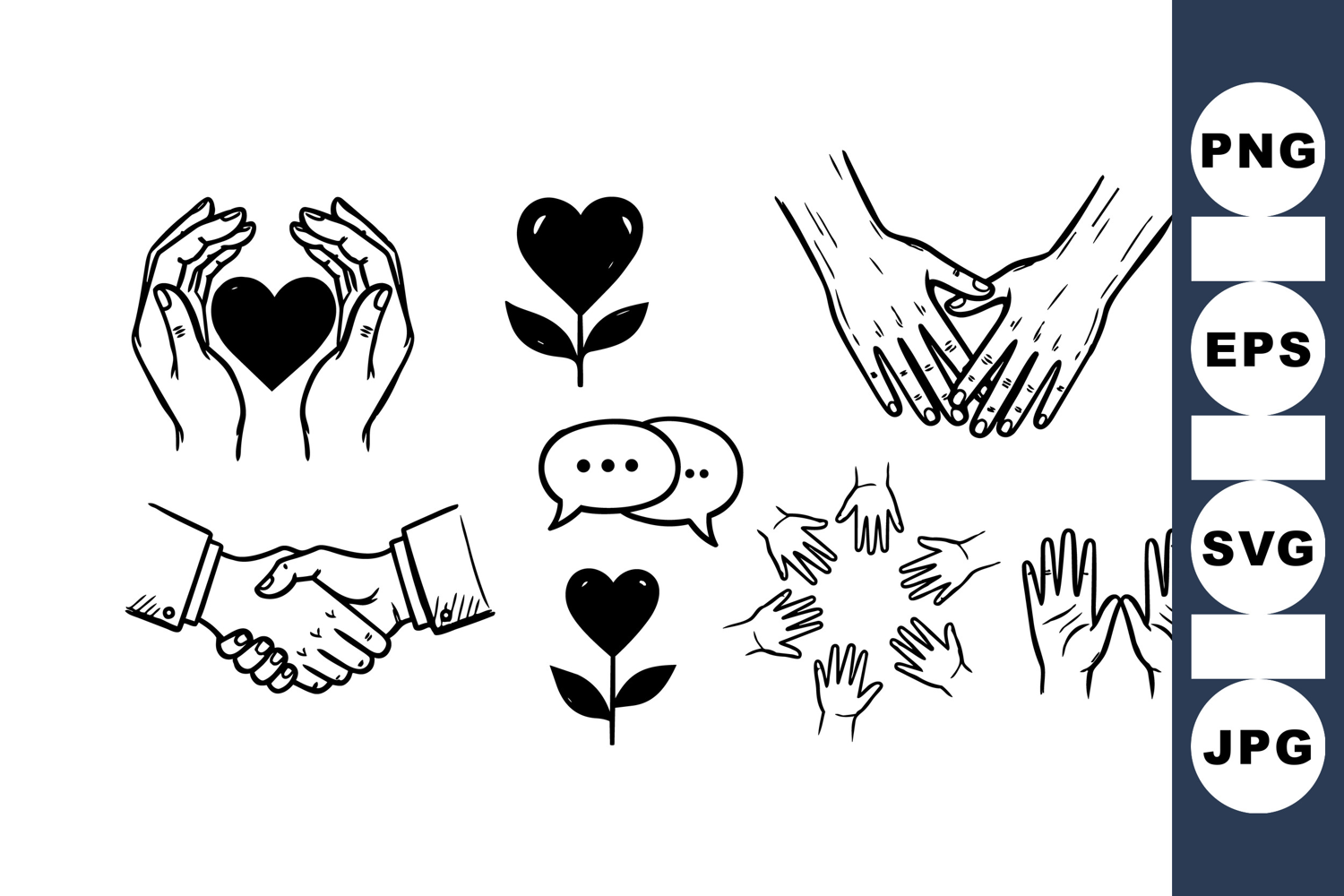 Simple black line art illustrations of hands holding hearts, handshake, speech bubbles, and flower hearts create a peaceful and friendly communication theme.