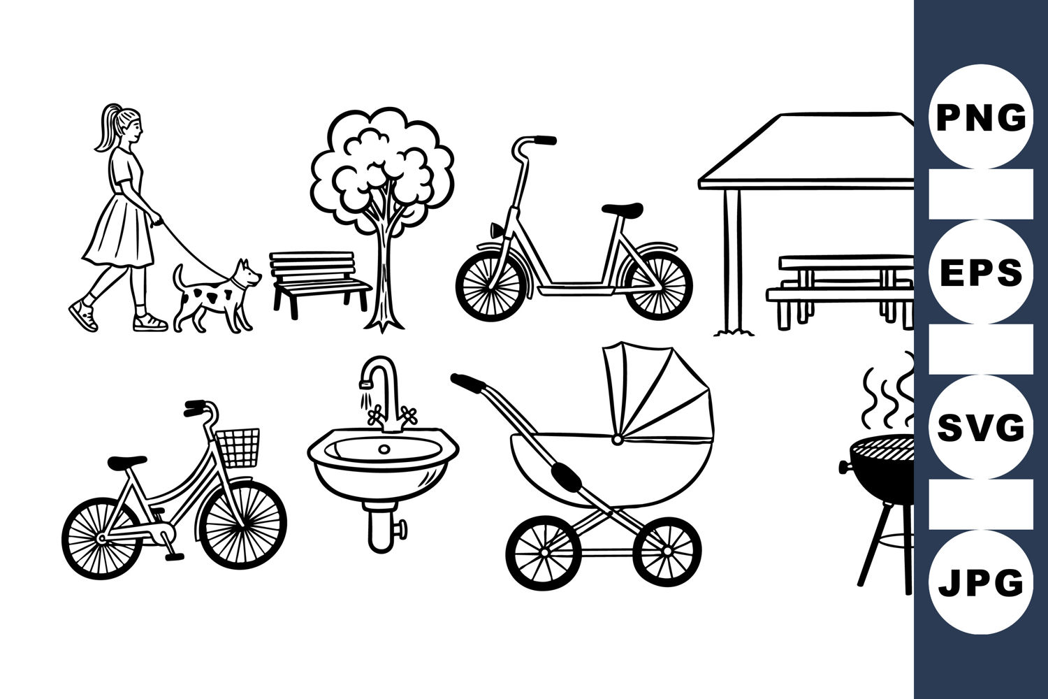 Simple black outline illustrations of outdoor elements including woman walking dog, bicycles, fountain, stroller, and barbecue grill in minimalistic style
