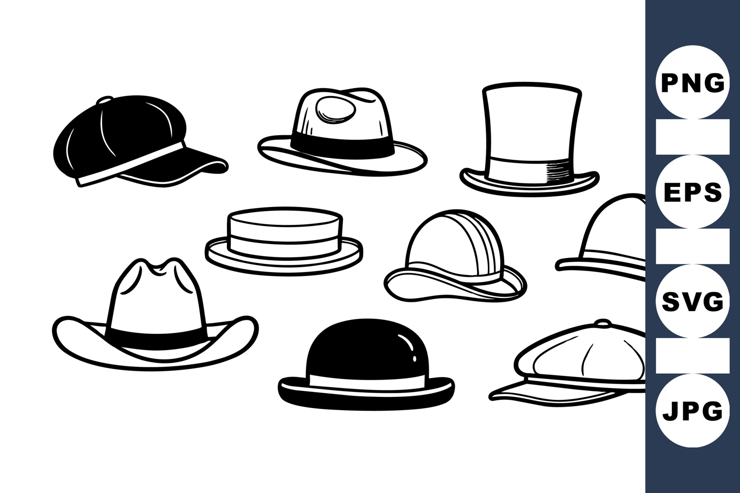 Line art collection features nine distinct hat styles including baseball cap, fedora, bowler, top hat, boater and more in black and white illustration