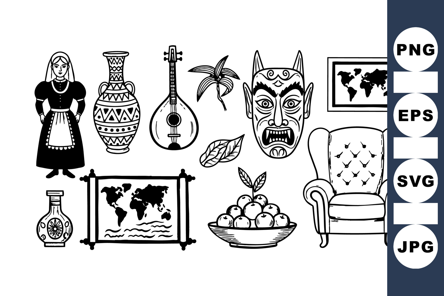 A black and white line art set showing various traditional cultural icons including a vase, string instrument, mask, armchair, and world maps, simple and classic style.