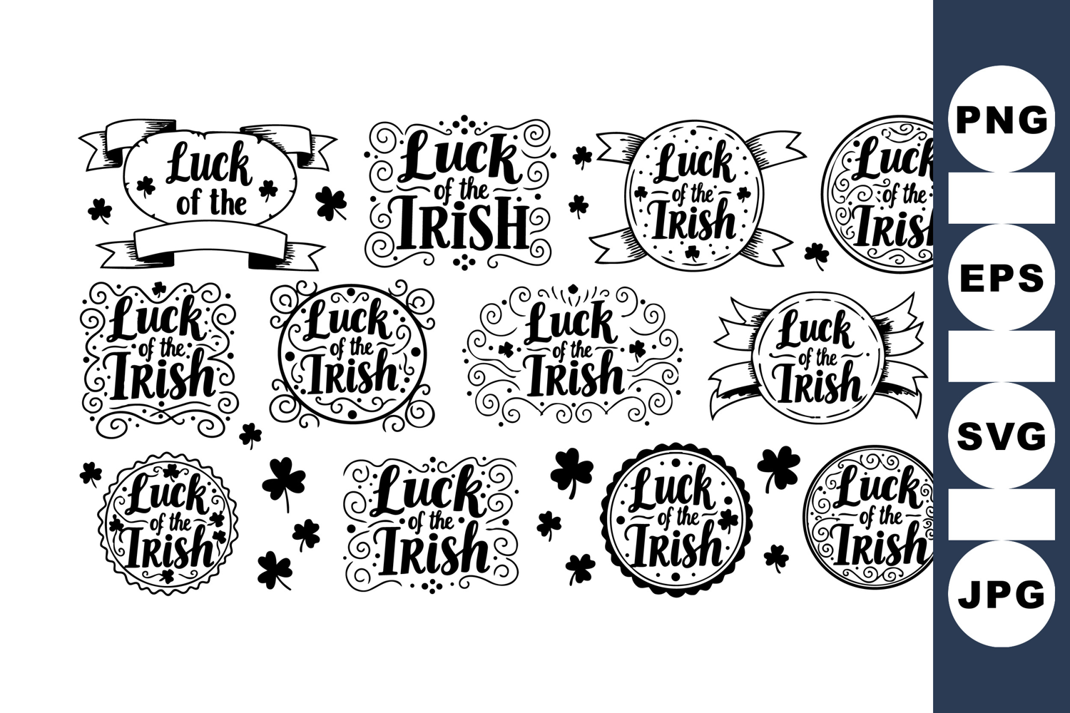 A hand lettered vintage badge collection displays luck of the irish circular emblems for st patricks day branding and print, festive.