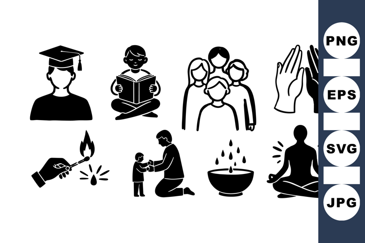 Black silhouette icons represent various activities including graduation, reading, family unity, prayer, fire lighting, gift giving, steaming bowl, and meditation in simple style.