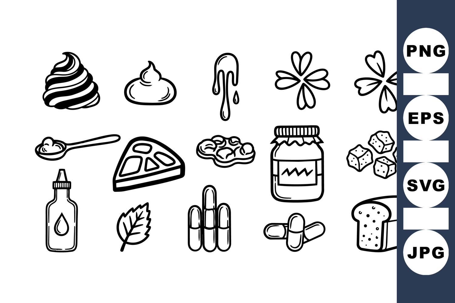 Hand drawn black and white line art food icons including ice cream, honey jar, pie slice, bread slice, and syrup bottle, suitable for print or web design, simple and clear style.