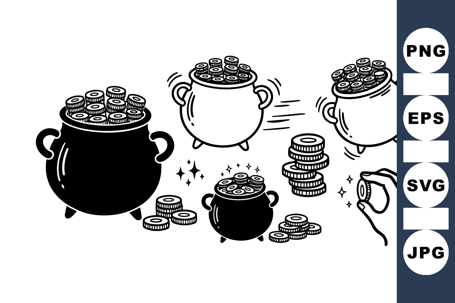 Black and white line art depicts various cauldrons filled with coins and a hand placing a coin, including sparkling effects for a whimsical mood.