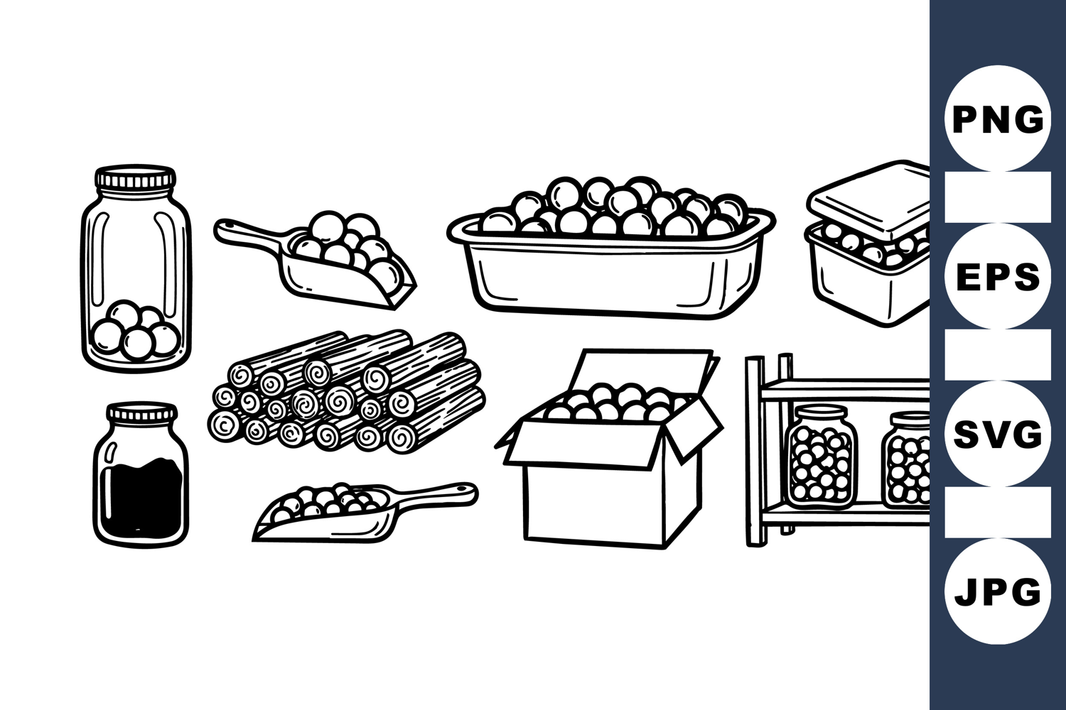 Hand drawn black and white line art showing jars filled with berries, bundles of sticks, scoop, carton of eggs, and a wooden shelf, presenting a rustic kitchen theme with simple clean lines, perfect for recipes or vintage branding projects, calm and classic mood