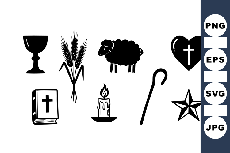 Minimalist black and white religious vector icons representing christian symbols such as chalice, bible, lamb, candle, and shepherd staff in simple style.