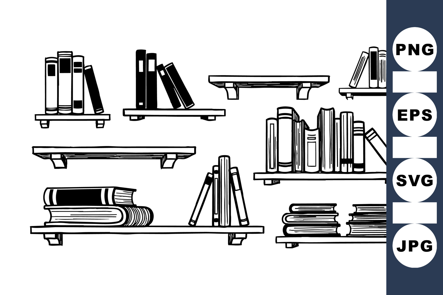 A collection of black and white line art illustrations showing books positioned on floating shelves in different arrangements, ideal for library or reading themes.