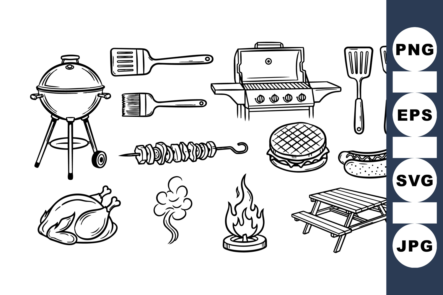 Black and white line art features various barbecue items including grill, tools, food, fire, and picnic table for outdoor cookout themes in simple style.