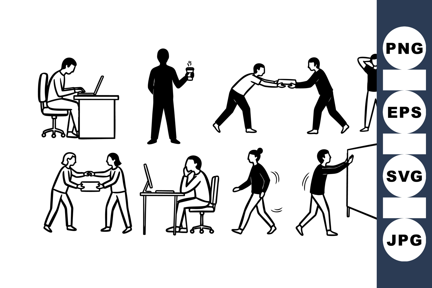 Silhouetted people engaged in various activities including typing at desk, drinking, shaking hands, walking and presenting on a board in minimal style.