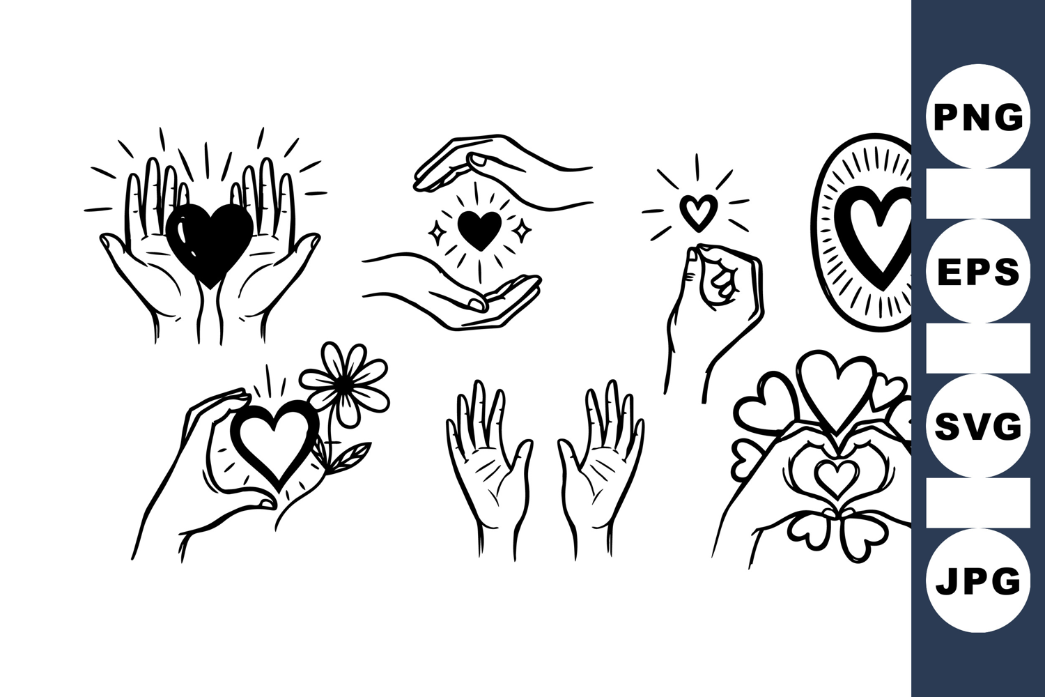 Minimalist black and white line drawings depict hands holding hearts and flowers in various caring and loving gestures conveying affection and warmth.