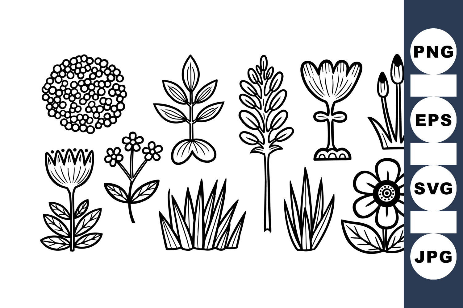 A collection of black and white line art featuring various floral elements including flowers, leaves, and grasses in simple graphic style, suitable for design and craft use.