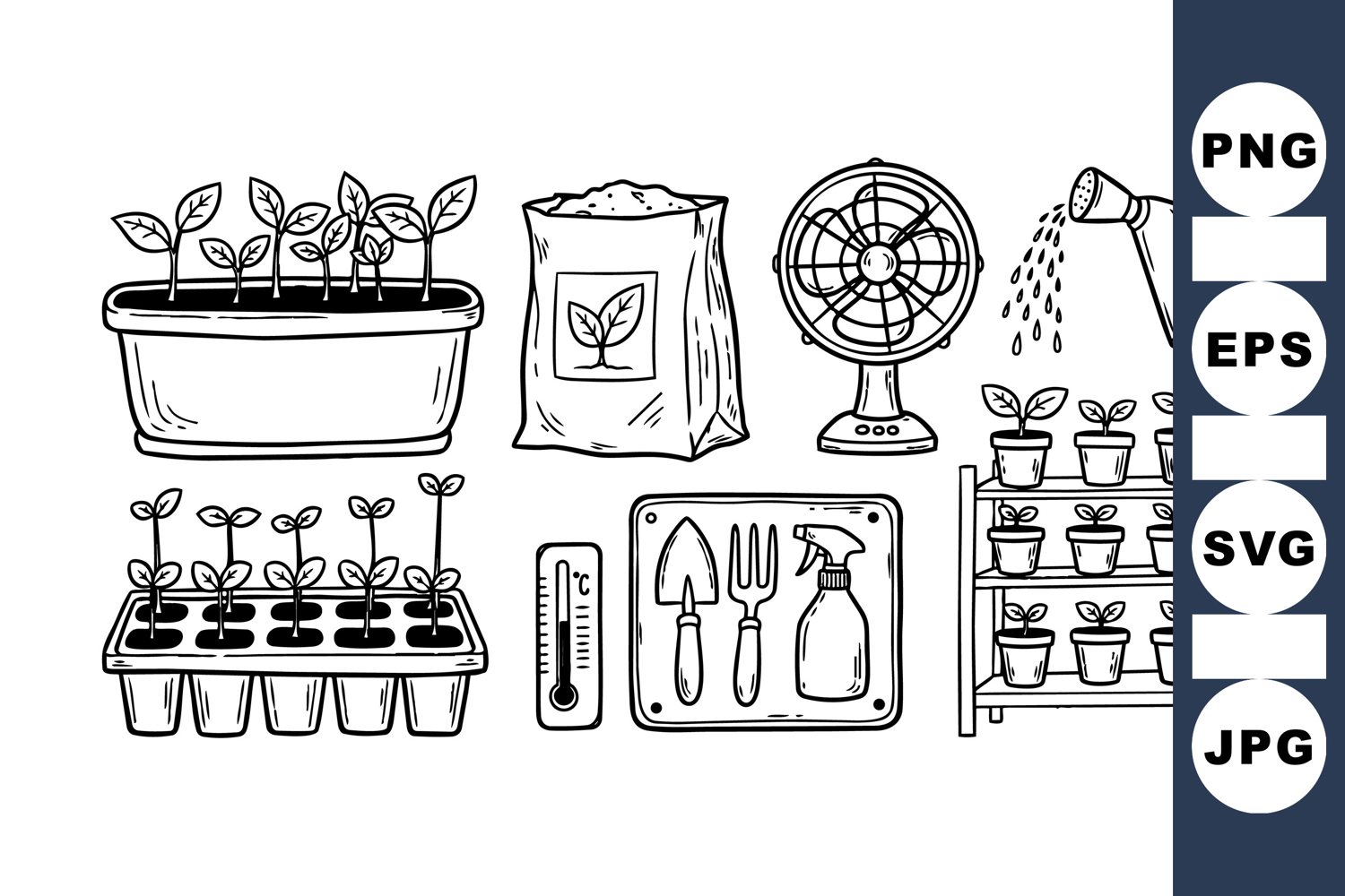 Hand Drawn Plants Gardening Tools Clipart Black White Garden Watering Can Illustration Plant Care Clipart Seedling Starter Set Potting Soil Bag Garden Fan Drawing Indoor Garden Kit Plant Shelf Clipart
