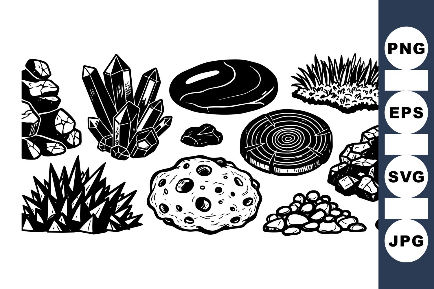 A collection of detailed black and white natural rock and mineral illustrations in graphic line art style for print or digital use, visually striking and clear.