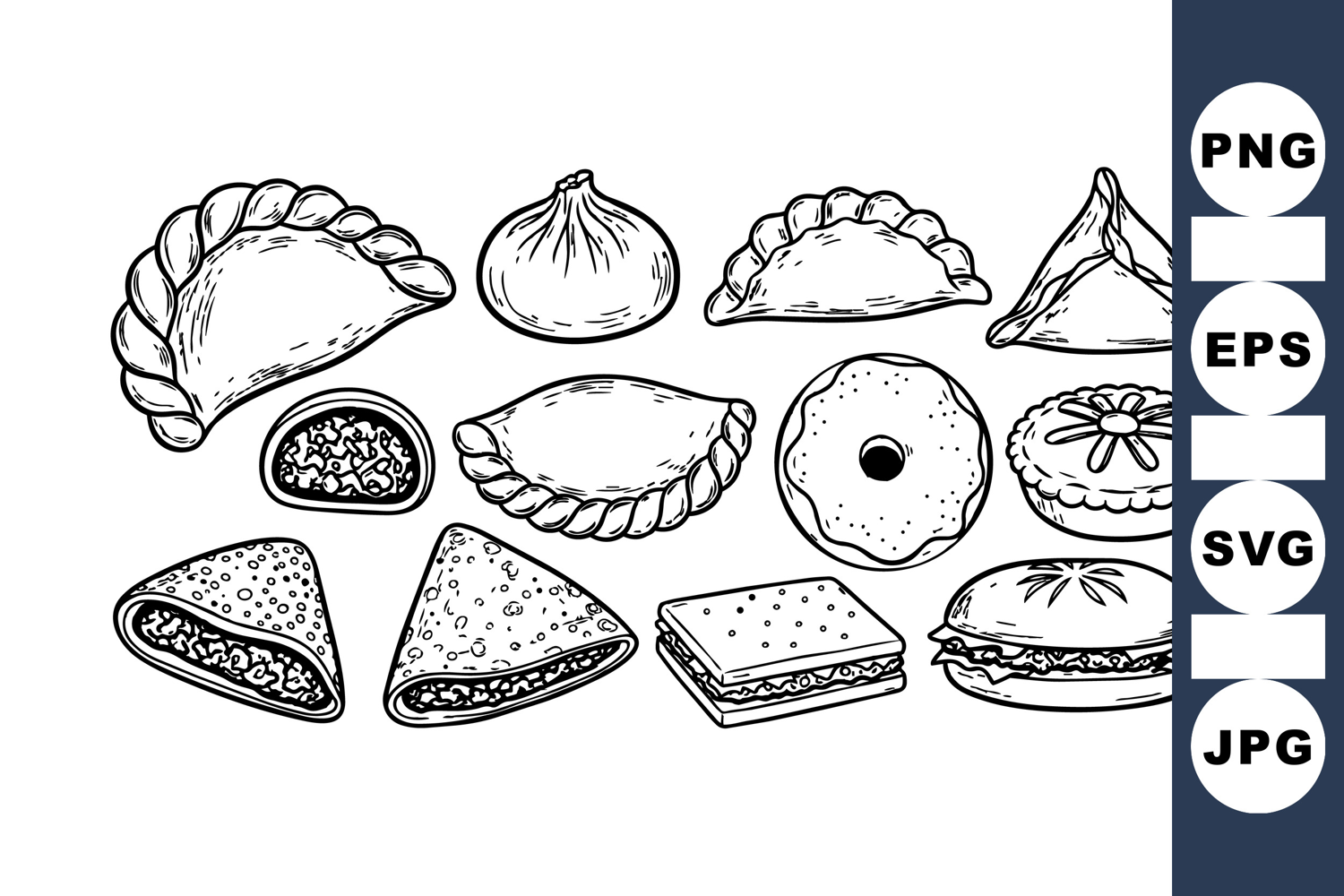 Hand drawn ink line art depicts assorted pastries and dumplings, used in recipe illustrations, packaging, and editorial, rustic.