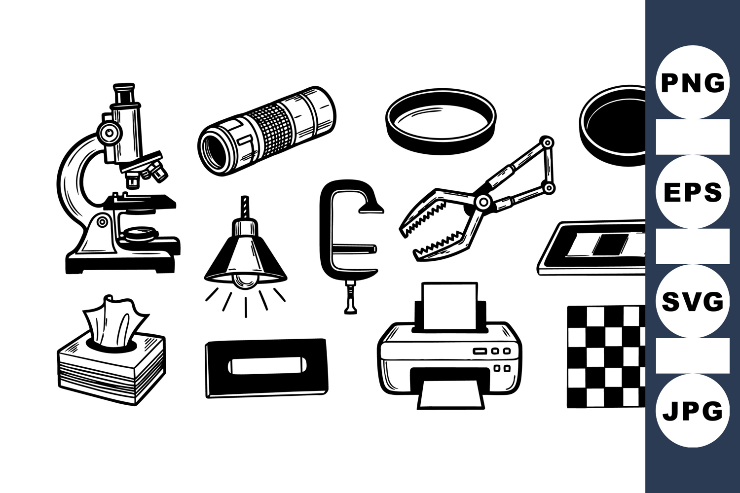 Black And White Clipart Office Equipment Icons Office Tool Collection Workspace Icon Set Minimalist Office Graphics Line Art Office Icons Business Supplies Clipart Technology Equipment Icons Printer And Lamp Clipart Laboratory Tool Kit