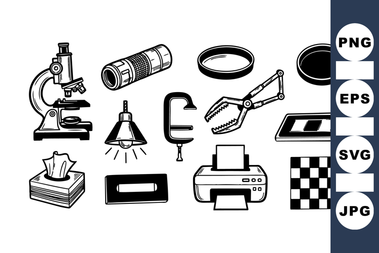 Collection of scientific laboratory equipment icons in black and white line art style ideal for educational and technical graphic design, precise and clean