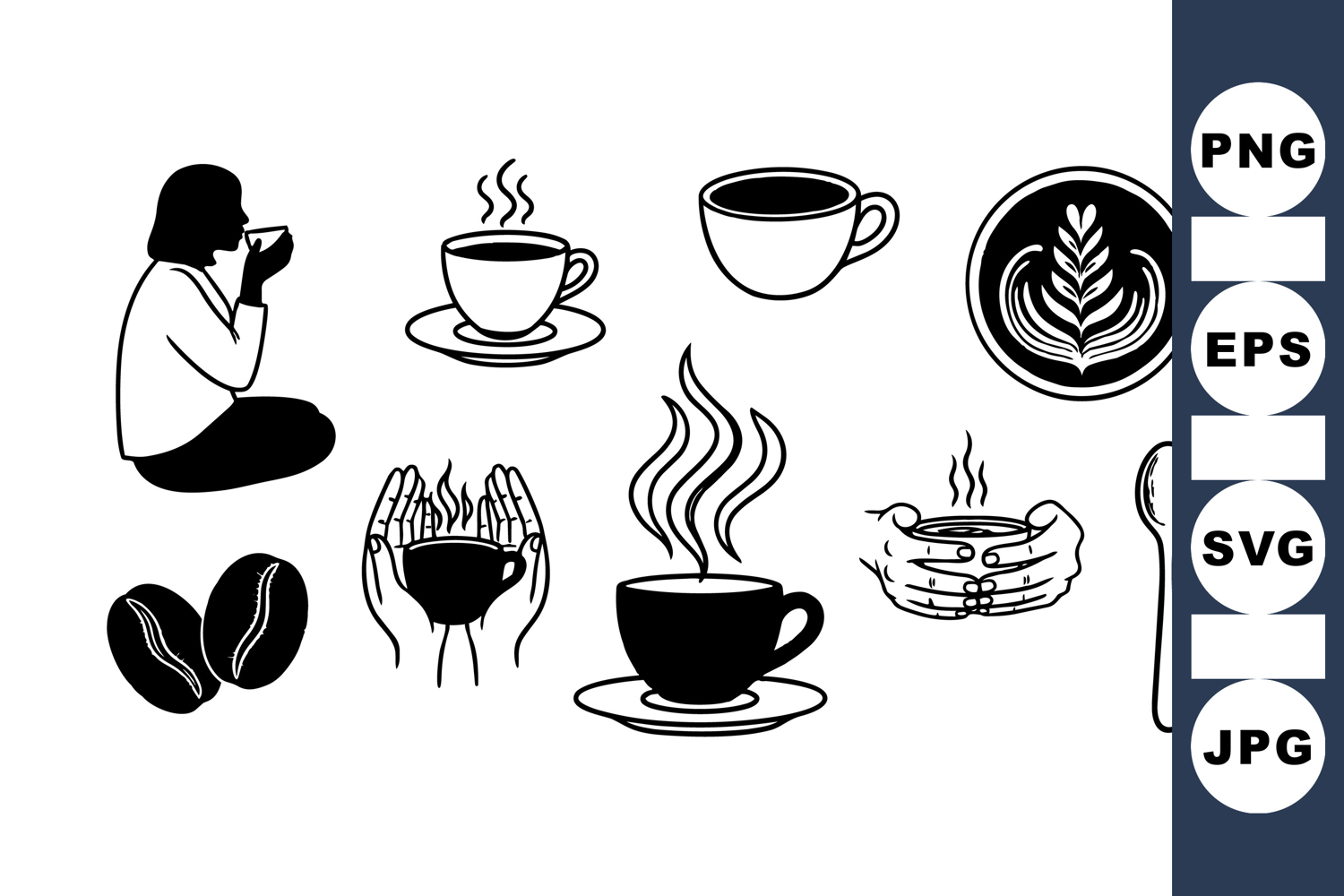 Simple black and white vector illustration of various coffee cups, beans, hands holding a cup, and person drinking coffee in minimalistic line art style.