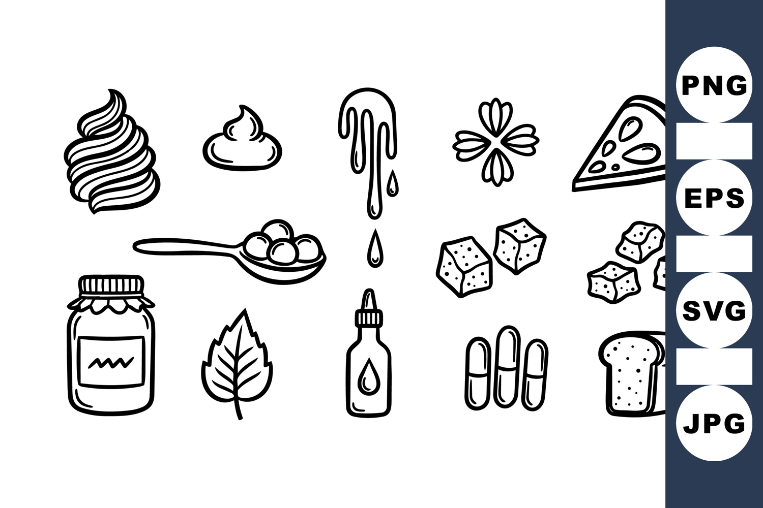 A collection of hand drawn food and natural ingredient icons in simple black line art style showing honey, sauce, pizza, bread, leaf, and capsules, minimal and clean.