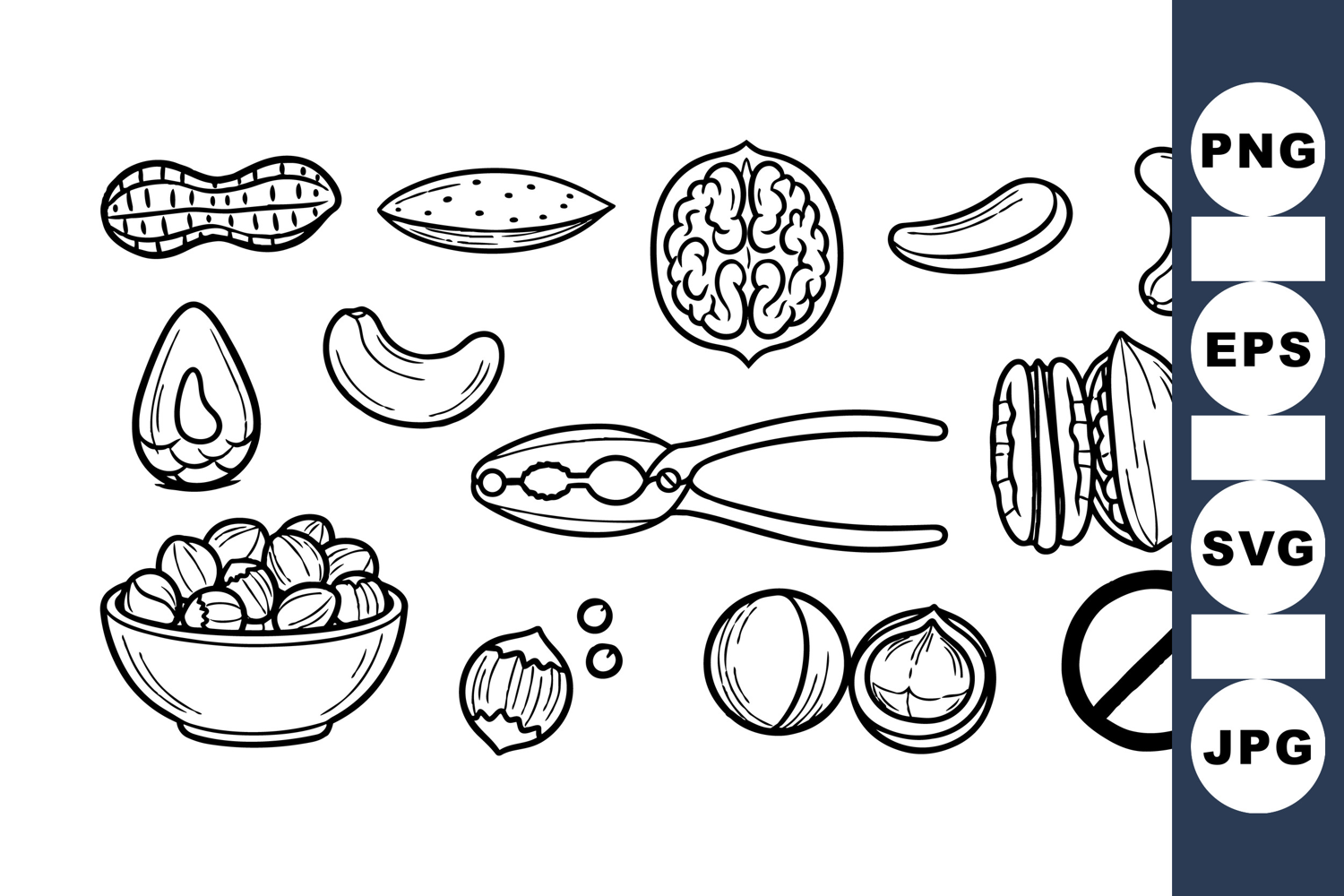 Black and white line art displays assorted nuts, seeds, and nutcracker tool arranged neatly in a clear outline style with simple decorative look.