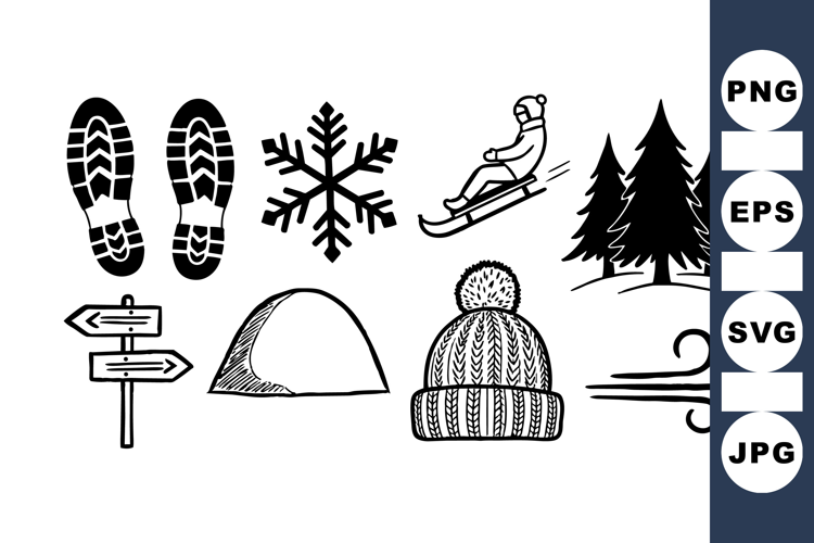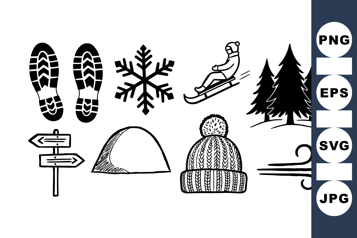 Cold Weather Design Winter Camping Clipart Outdoor Winter Icons Hand Drawn Adventure Snowy Forest Bundle Winter Hiking Set Camping Gear Collection Winter Sports Graphics Winter Nature Illustrations Sled And Snowflake