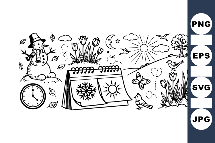 Hand drawn black and white doodle features a seasonal calendar showing winter and summer icons with snowman, sun, flowers, tree, clock, and butterflies in whimsical style.