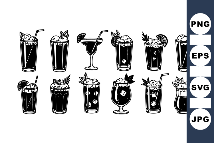 A black and white silhouette set of assorted cocktail drinks featuring straws and fruit garnishes, ideal for menu design or bar branding in minimalist style.