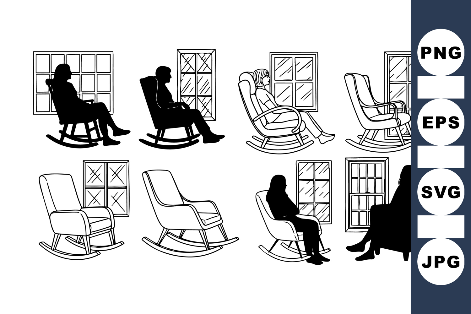 Silhouettes and outlines show an elderly person in a rocking chair beside windows, highlighting classic furniture design and peaceful indoor setting.