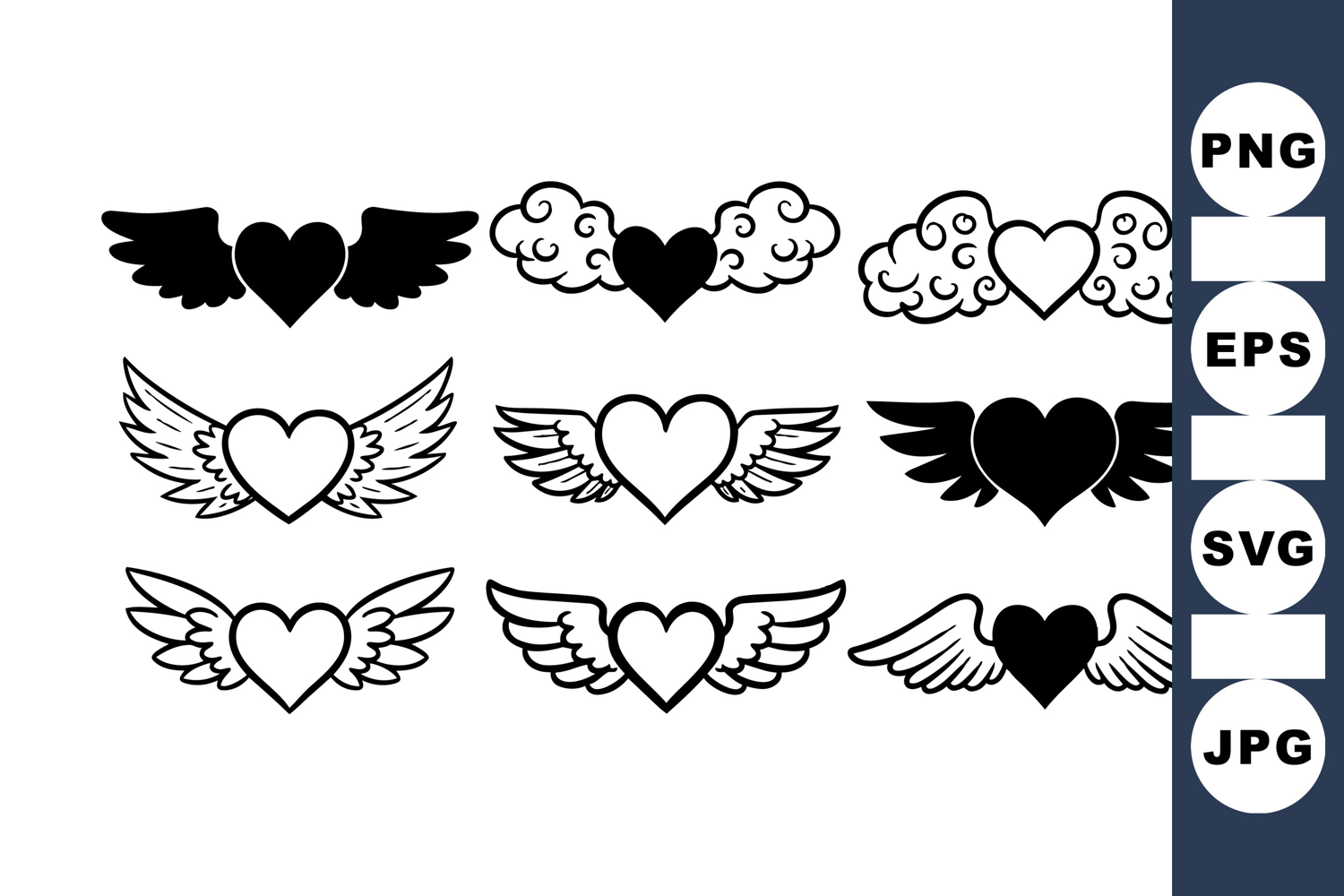 Valentine Day Clipart Heart Wings Clipart Black Heart Design Love Symbol Pack White Wings Vector Romantic Graphic Set Winged Heart Bundle Cute Heart Silhouette Simple Outlined Wings Flying Heart Artwork