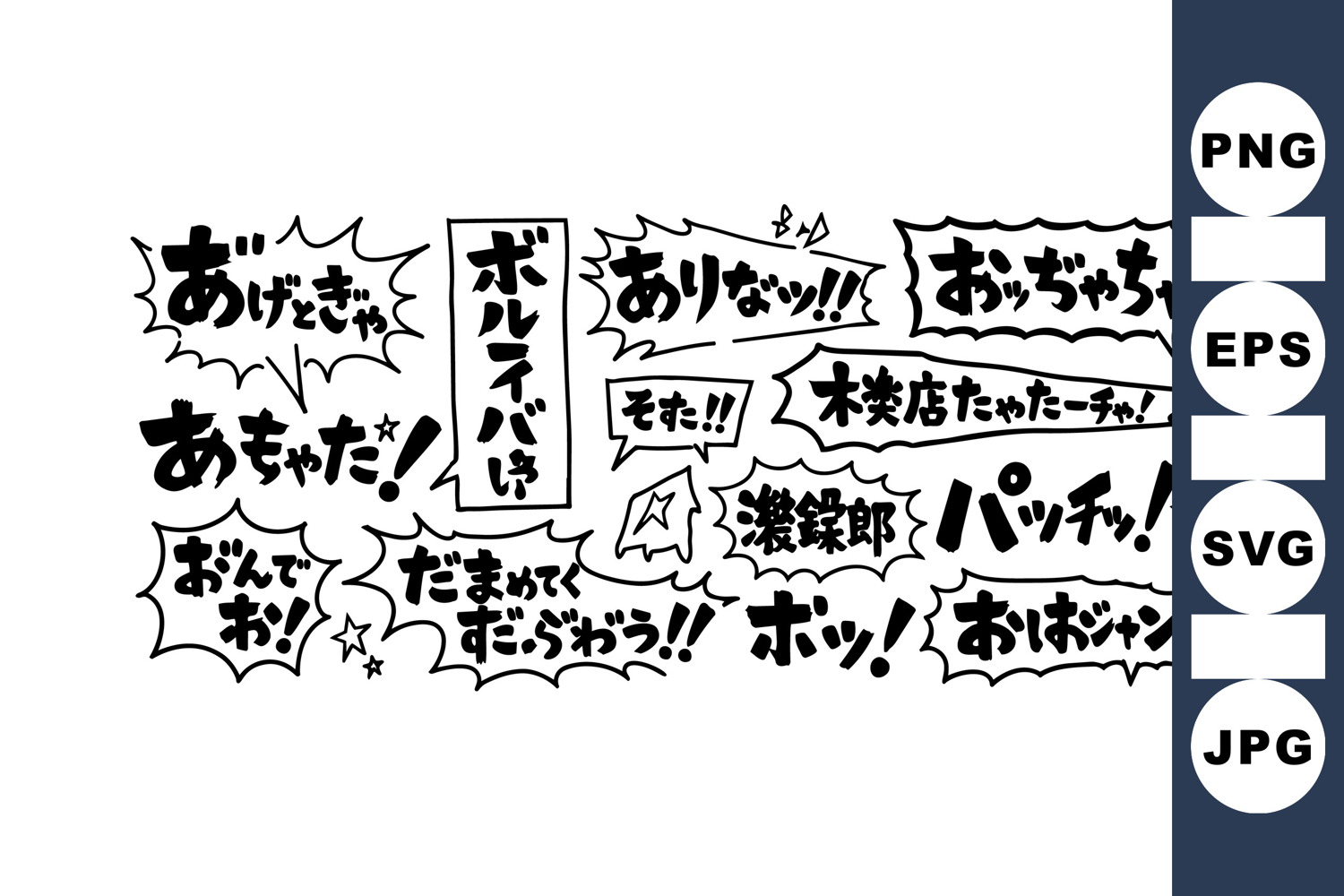 A collection of black and white japanese calligraphy speech bubbles featuring playful handwritten expressions and comic style text, suitable for graphic design and illustration projects.