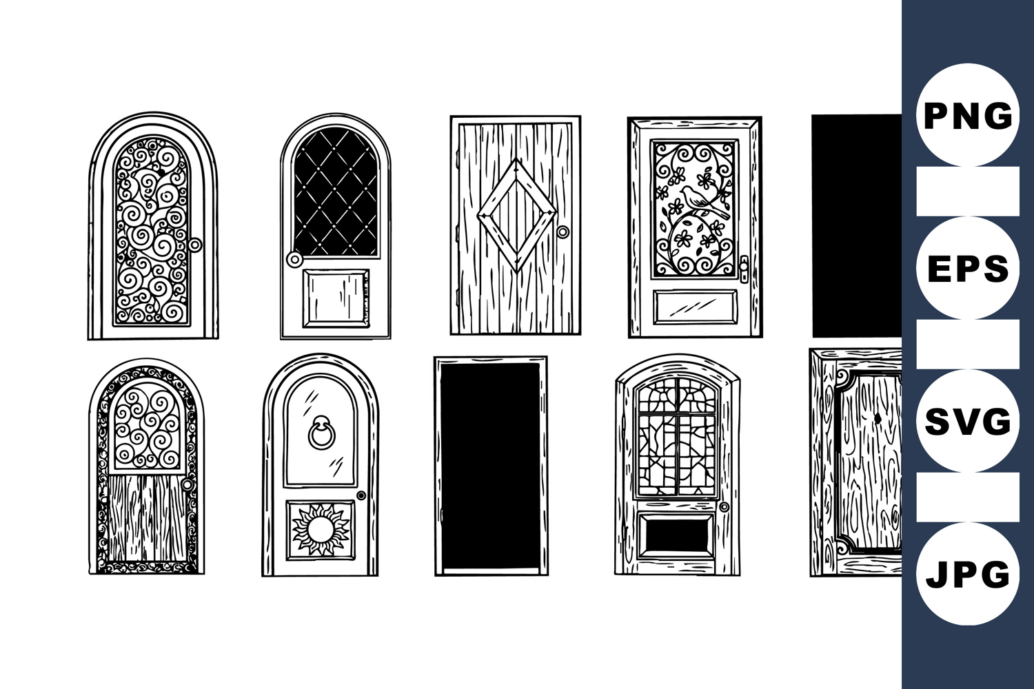 A detailed assortment of vintage doors with ornamental designs, woodgrain textures, and varied shapes, presented in monochrome line art suitable for historical or architectural themes.