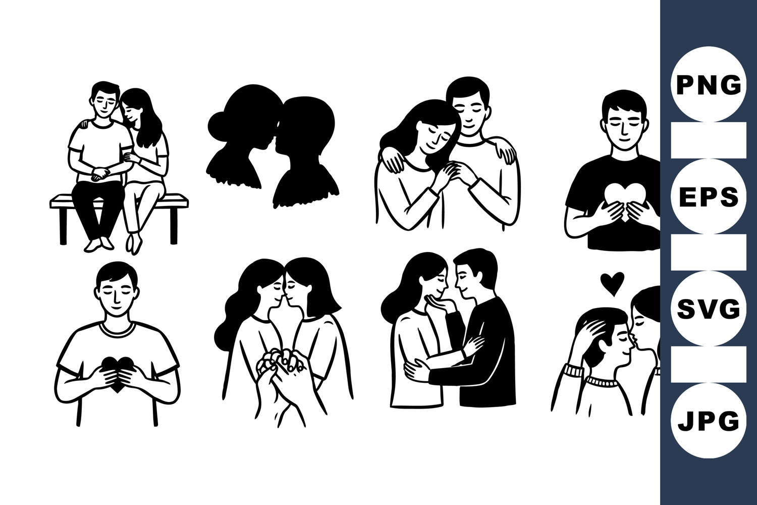 A collection of black and white line art illustrations showing a loving couple holding hands, hugging, and sharing intimate moments in romantic poses.