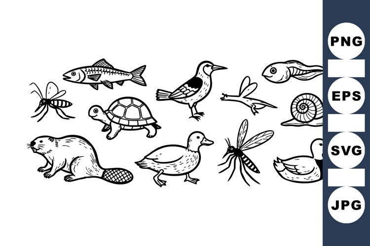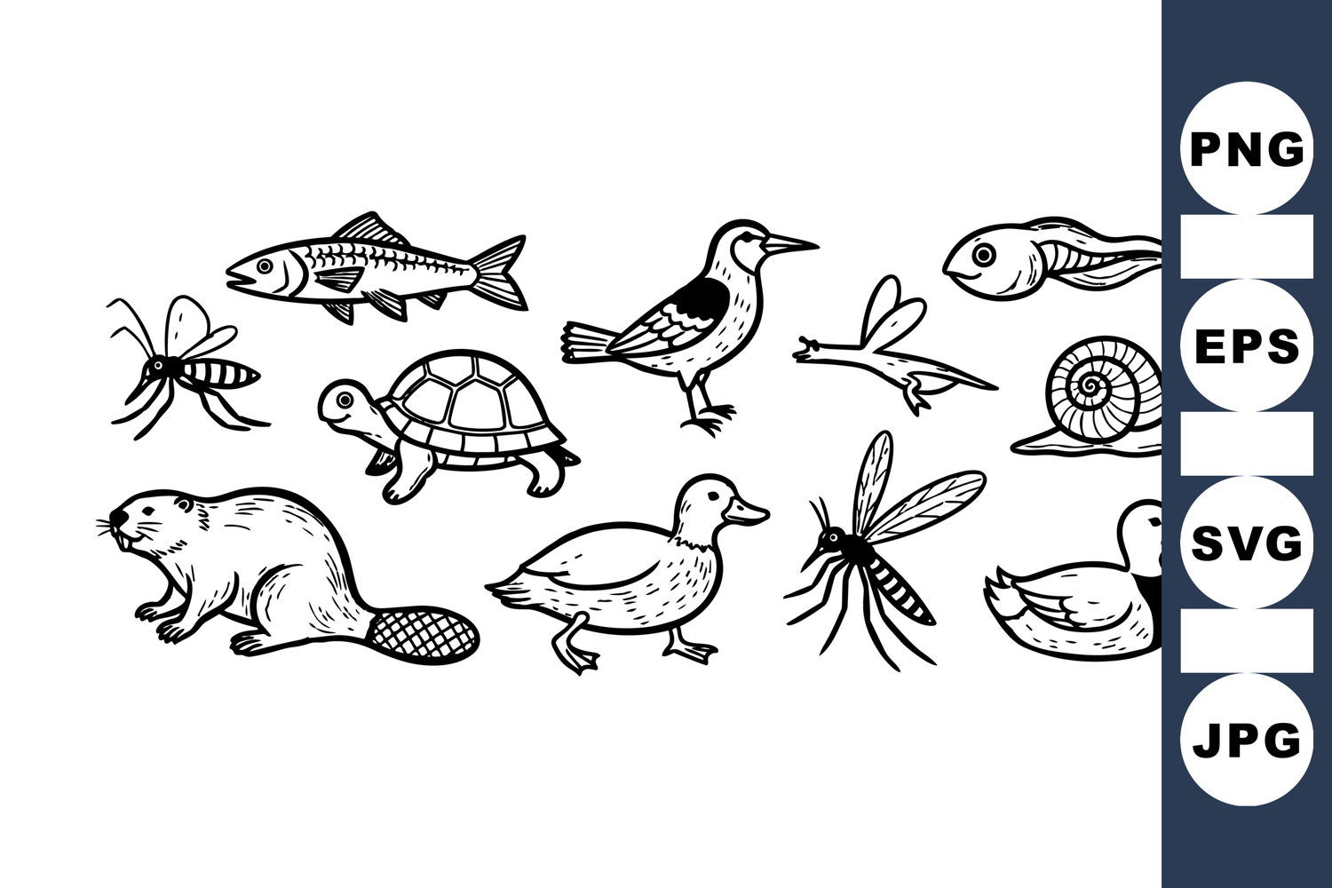 Detailed black ink vintage sketches display various animals including birds, insects, aquatic creatures, and a beaver in classic line art style, traditional and educational.