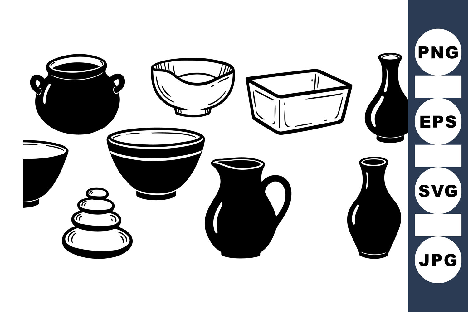 A collection of vintage style ceramic bowls, pitchers, and rounded stacking stones depicted in bold black and white line art against a white background, minimalist and clean.