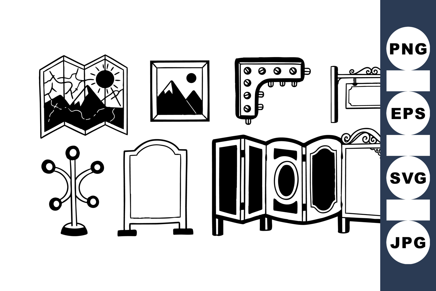 Black and white line art illustration showcasing diverse signage boards including maps, picture frames, coat rack, and folding screens with decorative details.